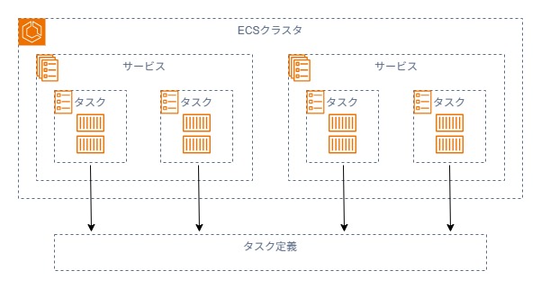 ECSの構成は階層的になっており、最上位に サービスがあり、その中で複数の タスクが実行されます。各タスクは タスク定義に基づいて構成され、使用するコンテナイメージ、CPU/メモリ、環境変数、ボリューム設定などが定義されています。サービスはタスクの数や実行状態を管理し、負荷分散やスケーリングを自動的に制御します。