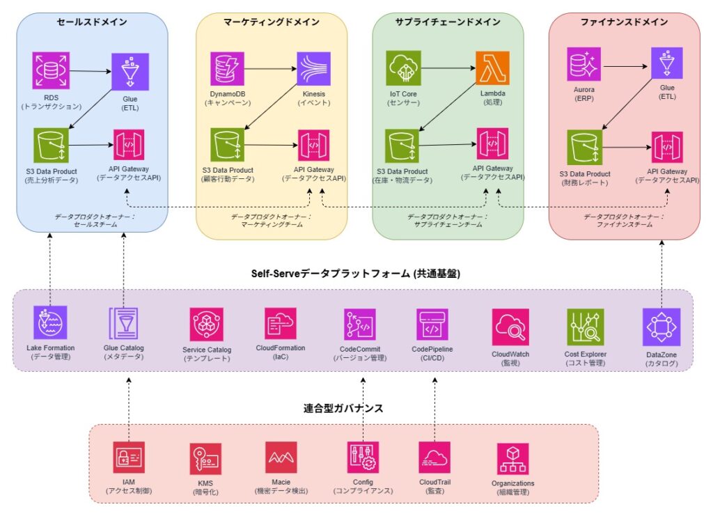 | セールスドメイン | データソース: RDS(トランザクション) 処理: Glue(ETL) データプロダクト: S3(売上分析データ) 公開: API Gateway経由 |