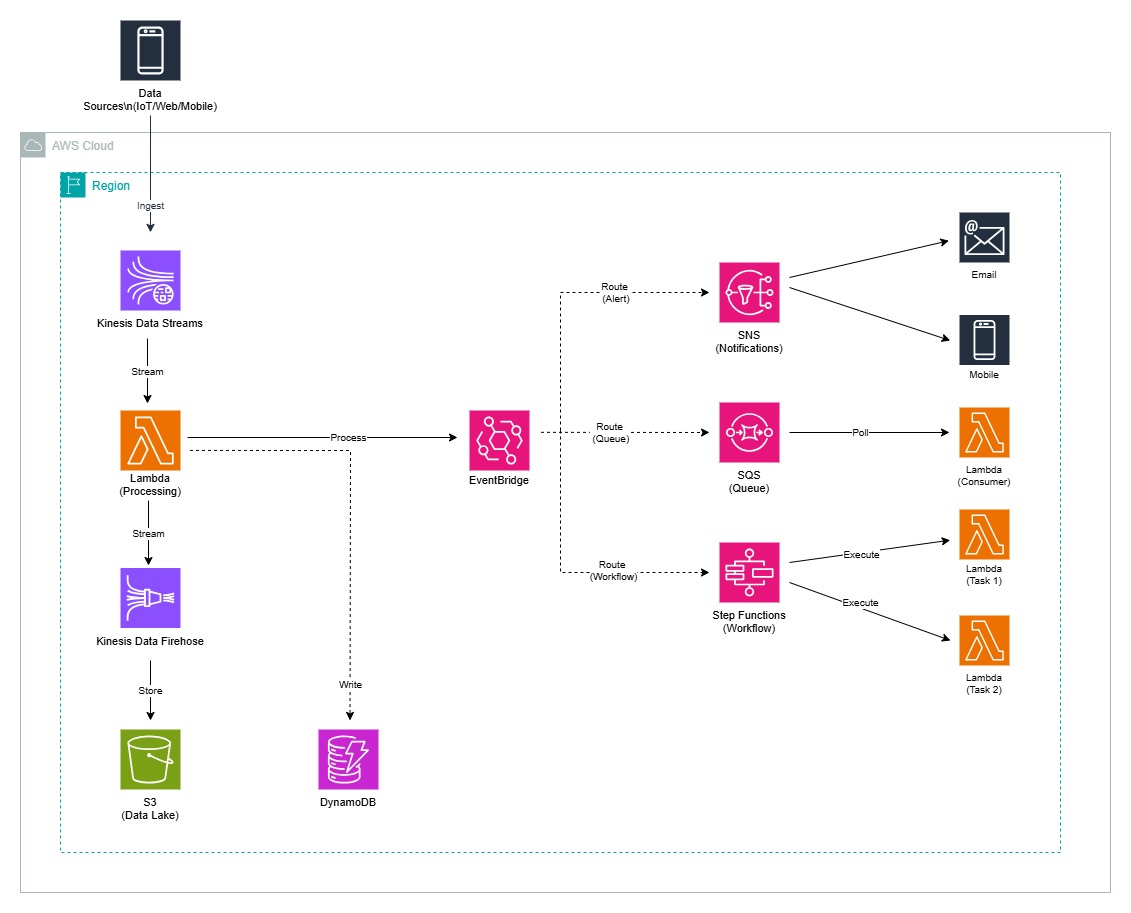 | 全体構成 | EventBridgeを中心としたリアルタイムデータパイプライン。ストリーミングデータを取り込み、処理し、複数の配信先に振り分ける構成。 |