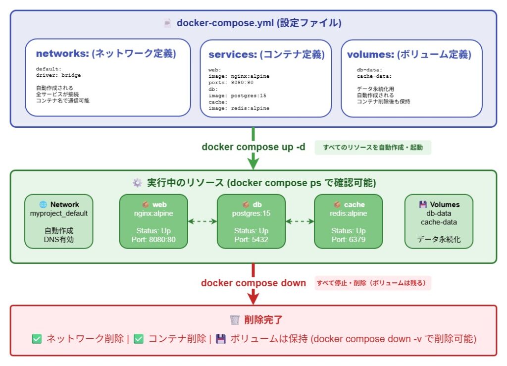 docker-compose.yml は、複数のDockerコンテナ構成を1つの設定ファイルで定義・管理するための YAML ファイルである。このファイルには、使用するイメージ、ビルド方法、ネットワーク、ボリューム、環境変数、起動順序などを記述し、 docker compose up コマンドにより、定義された複数のコンテナをまとめて起動・停止できる。