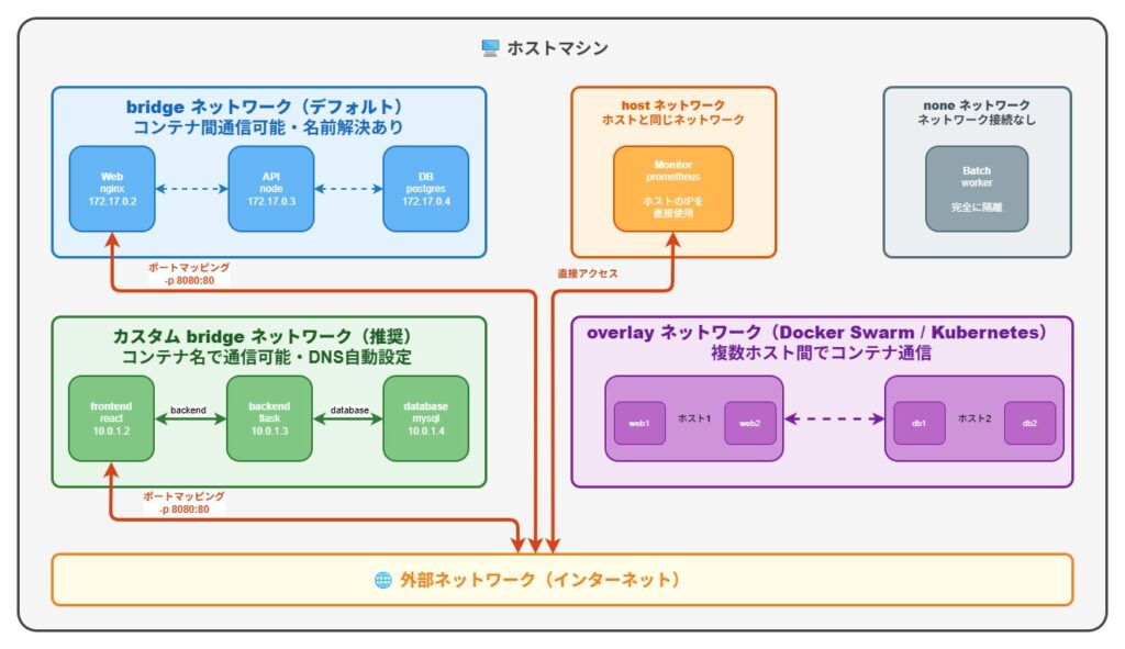 | 【推奨】 bridge(DNS名前解決) | コンテナ名で通信可能 | ポートマッピングが必要 |