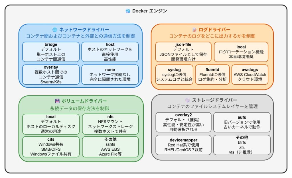 Dockerでは、ネットワークストレージボリュームログなど、様々なリソースを管理するために「ドライバー」という仕組みを使用します。ドライバーは、それぞれの機能の実装方法を切り替えることができるプラグイン機構で、用途や環境に応じて最適なものを選択できます。